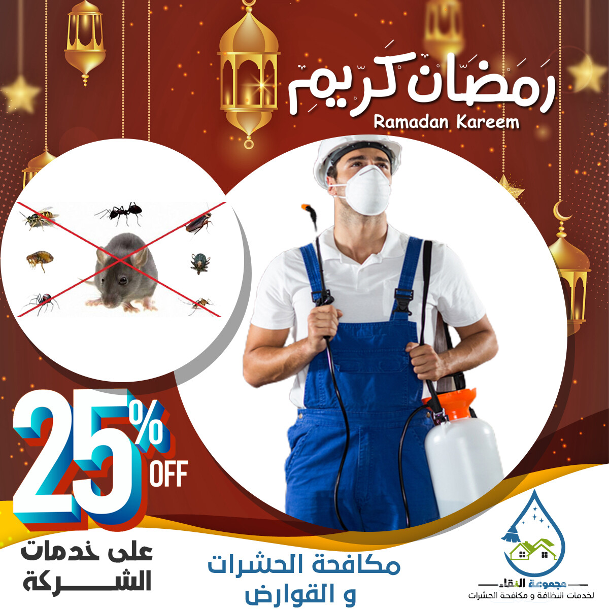 بمناسبة حلول شهر رمضان المبارك كل عام و أنتم بخير مجموعة النقاء تقدم لكم بمناسبة حلول الشهر الكريم خصم 25 % على كافة خدمات الشركة المختلفة التنظيف بالبخار ( تنظيف مجالس - تنظيف مراتب - تنظيف كنب - تنظيف مفروشات - تنظيف سجاد ) خدمات التنظيف المختلفة ( تنظيف الشقق - تنظيف الفلل و القصور - تنظيف المطاعم - تنظيف الشركات - تنظيف المصانع - تنظيف المساجد ) مكافحة الحشرات و القوارض غسيل و تنظيف و تعقيم الخزانات مجموعة النقاء لخدمات النظافة ومكافحة الحشرات من افضل شركات التنظيف و مافحة الحشرات و تعقيم و تطهير الخزانات بجدة : 1- لدينا افضل المطهرات والمعقمات المستخدمة في عمليات التطهير داخل المنازل. 2- اجهزة تنظيف بالبخار بجدة حديثة وباعلى الامكانيات . 3- عمالة مدربة و محترفة في التنظيف . 4- ارخص شركة تنظيف منازل بجدة . 5- شركه تنظيف بجده رخيصة ومجربة ومضمونة . 6- دقة والتزام فى المواعيد اتصل بنا الان على الرقم التالى او ارسل لنا على الواتس اب على الرقم التالى : whats app : 0545002837 لمزيد من المعلومات عنا قم بزيارة موقعنا الالكترونى التالى : http://elnqaaclean.com