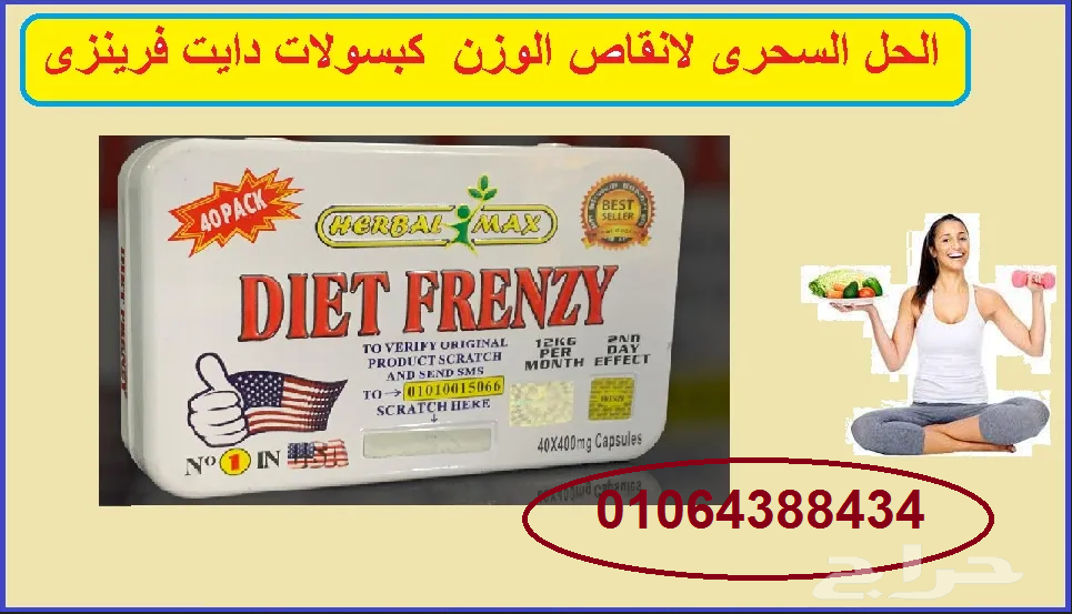 دايت فرينزي من أقوي كبسولات سد الشهية و حرق الدهون بعد التجارب الواقعية علي بعض العملاء تحتوي على جارسينيا كامبودجيا خلاصة الشاي الاخضر خلاصة القهوة الخضراء خلاصة الصبار ستيرات المغنيسيوم النباتية الزعرور البري صمغ الغار و بعض الفيتامينات والمعادن الهامة للجسم فيتامين D فوليك اسيد فيتامين B12 تظهر النتيجة من اول اسبوع مع الاستخدام الصحيح الساحر دايت فيرنزي صانع المعجزات لنحت الجسم مع افضل منتج للتخسيس الى خسس نص ستات مصر أخيرا وبعد طول انتظار كل الناس الى بتسأل علية رجع تانى الاصلى وبشكل جديد ومميز المنتج رقم واحد كبديل لتكميم المعده .دايت فرينزي الذي ينصح به الأطباء لفقد الوزن الزائد بامان تام. وبعد طول انتظاره      وصل أقوى منتج تخسيس دايت فرينزي مدمر الخلايا الدهنيه وقاطع الشهيه مستخلص التوت الأبيض للتنحيف وكبح الشهيه مستخلص أوراق التوت الأبيض مصممه خصيصا للحد من الام الجوع دون تقييد السعرات الحراريه او تغيير روتينك اليومي بدون اي أعراض جانبيه لا توتر لا غثيان لا صداع يقلص المعده على الفور؟ يعمل بقوه على دهون البطن فوائد مستخلص التوت الابيض: فقدان الوزن من كل مكان من البطن الفخذين للاتصال بنا علي الارقام التالية من داخل مصر 01064388434 واتس اب 01064388434 متوفر شحن الي جميع المحافظات