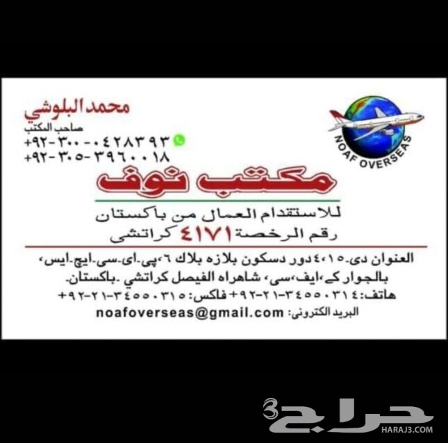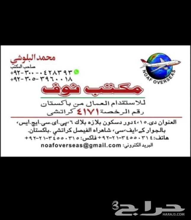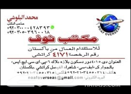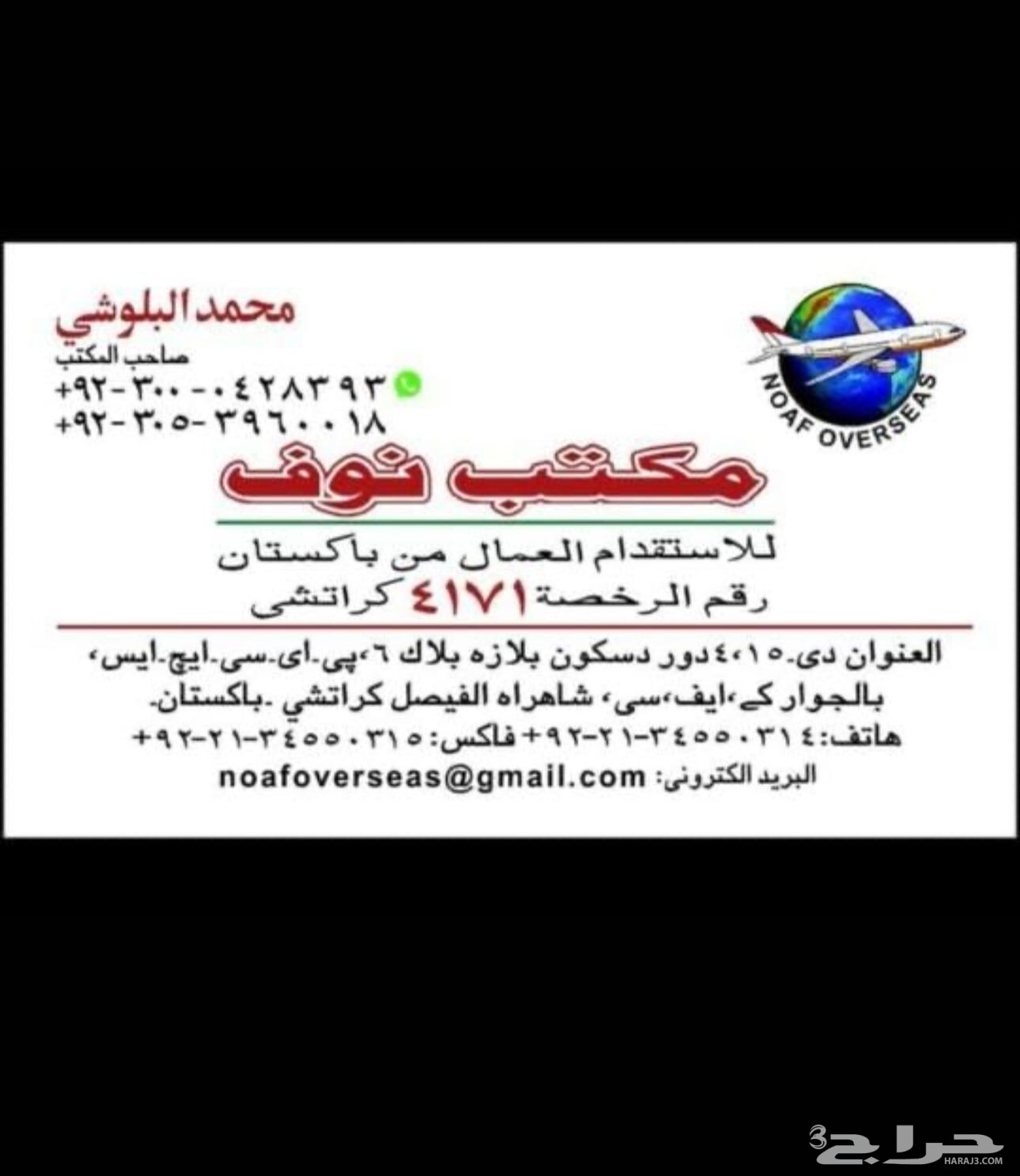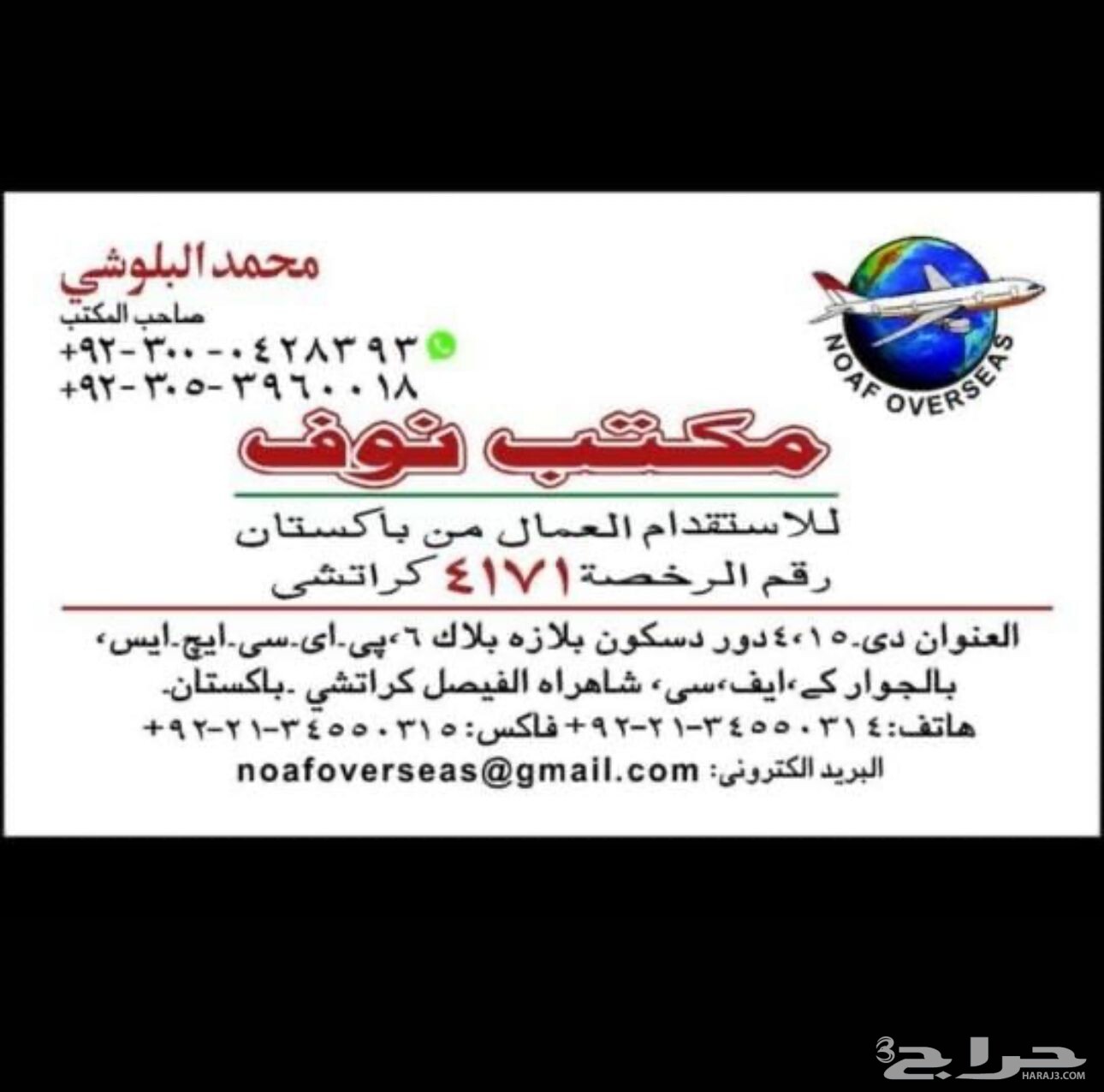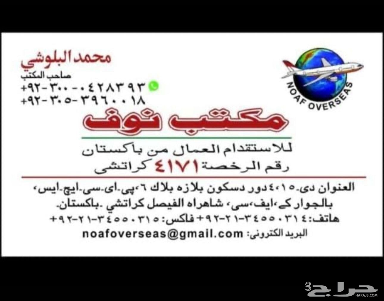 مكتب نوف للاستقدام من باكستان.... يسرنا تقديم عرضنا المميز لتوفير العمالة من دولة باكستان.. نحن بعون الله نقوم بتخليص جميع الاجراءات المطلوبه ونجلب لكم على حسب شروطكم ونمدكم بما تحتاجونه من العمالة المؤهلة في كافة المجالات المرخصة في الموارد البشرية الفنية والمؤهلة نستطيع أن نوفر لكم أفضل الأيادي العاملة ونضمنها لكم لدينا فريق متخصص لدراسة طلباتكم وإجراء المقابلات واختبار المتقدمين والتأكد من الحصول على أفضل المرشحين..... لتواصل جوال واتساب محمد البلوشي 00923000428393 00923053960018