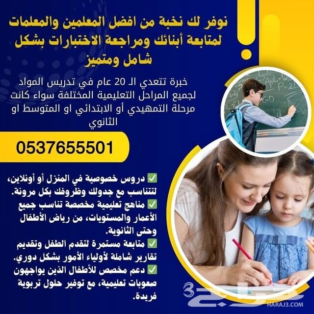 نوفر لك إمكانية الاستفادة من خدمات التعليم عن بعد، حيث تعمل معلماتنا على تقديم حصص اون لاين بشكل احترافي، مما يتيح للطلاب الاستفادة من أساليب تعليمية متطورة أينما كانوا. تستخدم معلماتنا أدوات تكنولوجية حديثة لتوفير تعليم متكامل، مع التركيز على تشجيع الطالب على التفاعل والمشاركة في عملية التعلم، الأمر الذي يعزز من فهمهم للمادة ويُسهم في تحقيق أهدافهم الأكاديمية.