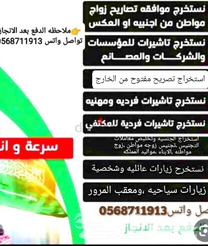 السلام عليكم اسعد الله اوقاتكم بكل خير اعلان استخراج تصاريح زواج للسعوديين والسعوديات الراغبين الارتباط باجانب سواء داخل المملكة أو خارجها تصحيح اوضاع الزواج التى تمت بدون تصريح رسمي، نتعامل مع الجهات الرسميه لظمان توثيق الزواج وفقا للقوانين ✓تخليص معاملات تصاريح الزواج ✓تخليص معاملات التجنيس القدوم الجنسية السعوديه »شروط التجنيس تجنيس زوج مواطنه الاجنبي نجنيس زوجه مواطن الاجنبيه تجنيس اولاد المواطن تجنيس اولاد المواطنه تجنيس مواليد المملكة تجنيس المقيمين أصحاب المهن والمستثمرين ""استقبال خدمات "" استخراج تاشيرات فرديه سائق خاص رعاه -تاشيرات فنيه ومهنيه ، لجميع الجنسيات -تاشيرات زيارات شخصيه ،عائليه، مرور ،سياحه، استقدام عوائل: انجاز سريع »دقه ف المواعيد، اسعار منافسه، مظمون ظمان الدفع عقب الانجاز للاستفسار واتس 0568711913 https://wa.me/+966568711913