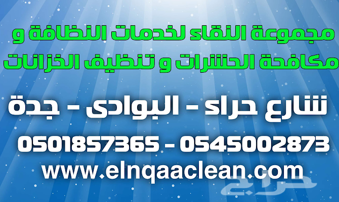 افضل شركة نظافة بجدة تنظيف وتعقيم المنازل المفروشة والجديدة تنظيف وتعقيم بالبخار للمفروشات المنزلية تنظيف وتعقيم وتلميع الارضيات والزجاجات تنظيف وتعقيم الارضيات الخشبية الباركيه مجموعة النقاء لخدمات النظافة من أفضل شركات تنظيف وتعقيم الكتب والمجالس بالبخار تنظيف وتعقيم السجاد والموكيت بالبخار تنظيف وتعقيم وتجفيف بالبخار للمفروشات تنظيف وتعقيم وتنشيف بالبخار للمفروشات تنظيف وتعقيم خزانات مياه الشرب بجدة تنظيف وتعقيم وتلميع المسابح تنظيف الشقق المفروشة والفلل والعمائر تنظيف شامل كل شئ بأفضل جودة فقط اتصل نصلك اينما كنت للمعلومات والتواصل زور موقعنا 0545002837 http://elnqaaclean.com https://g.page/r/Cd0drSKj8Vg2EAE