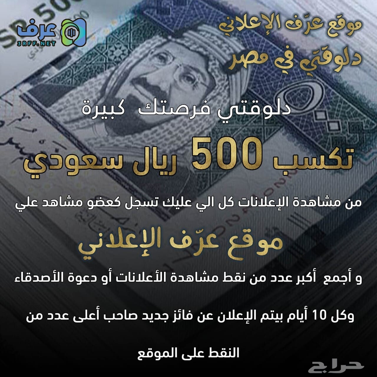 دلوقتي فرصتك كبيرة تكسب 500 ريال سعودي من مشاهدة الإعلانات كل الي عليك تسجل كعضو مشاهد على موقع عرّف الإعلاني و أجمع أكبر عدد من نقط مشاهدة الأعلانات أو دعوة الأصدقاء وكل 10 أيام بيتم الإعلان عن فائز جديد صاحب أعلى عدد من النقط على الموقع مع هذا الرابط // 3rrfad.com
